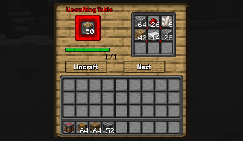The Uncraft and Next Recipe buttons provide visual feedback: they briefly display a "pressed" texture when clicked, and turn blue when hovered, making the interface more responsive and enjoyable.