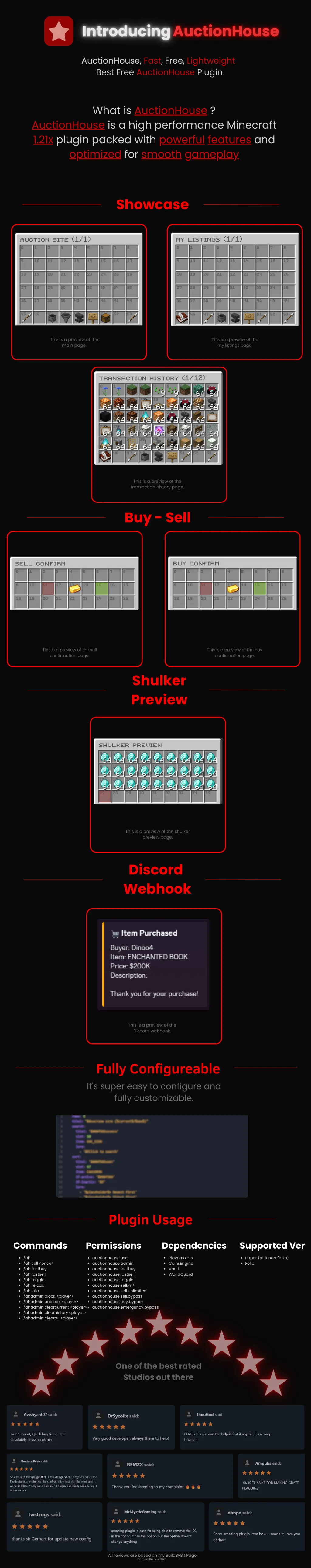 🚀 Highlights Fast, flexible, and fully customizable auction system YAML-only configuration Modern color code support Clean, responsive GUI design Multi-economy support with seamless integration Advanced transaction history and player preferences ⚙ Fully Configurable Messages & GUIs All messages and GUI titles are loaded from messages.yml and GUI configuration files No hardcoded strings No hidden fallbacks Everything is fully reloadable without restarting the server Customizable sounds for every action 🎨 Modern Color Code Support Supports Hex colors: &#RRGGBB, #RRGGBB, &RRGGBB Supports legacy & and § color codes Designed for clean and modern UI formatting Full RGB color support for premium aesthetics 🛒 Advanced Auction System Flexible Listing Options Configurable auction duration (default: 24 hours) Min/max price controls Support for renamed items (configurable) Automatic item name translation support Shulker box content preview Smart Auction Management Automatic cleanup of expired auctions Configurable deletion timeframe for unclaimed items Fast buy/sell permissions for VIP players Emergency disable system for maintenance Blacklist system for restricted items Player Preferences Persistent player settings Toggle auction notifications Customizable viewing preferences Auto-reopen options after transactions 📊 Transaction Logs & History Comprehensive transaction tracking Player-based purchase and sales history Real-time transaction updates Optimized caching for fast queries Full audit trail for all marketplace activities 🔍 Advanced Search & Filtering Powerful search system for finding items Category-based filtering Price range searches Player-specific listings view Search result caching for performance 💰 Multi-Economy Integration Supported Economy Plugins Vault (standard economy) CoinsEngine (custom currencies) PlayerPoints (points-based economy) Custom Money Formatting Compact formats (k / m / b / t) Fully configurable via money-format.yml Automatic currency conversion Clean display formatting 🪧 Sign API Integration Create auction signs for quick access Interactive sign-based browsing Automatic sign updates WorldGuard region protection support 🔔 Discord Webhook Integration Real-time auction notifications to Discord Customizable webhook messages Transaction alerts Server-wide marketplace updates Configurable event triggers 🛠 Configuration & Storage YAML-Only Configuration All settings are configurable via YAML: