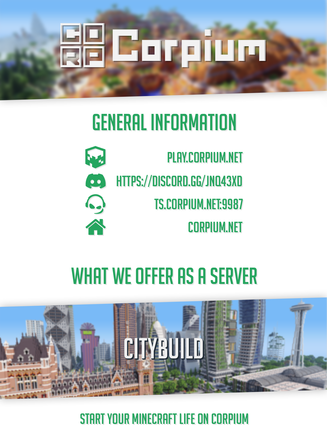 Corpium is one of the oldest German Minecraft servers and has been around since 2011. We offer a fair, non-pay-to-win gaming experience, a mature community, and continuously updated content for long-term fun.