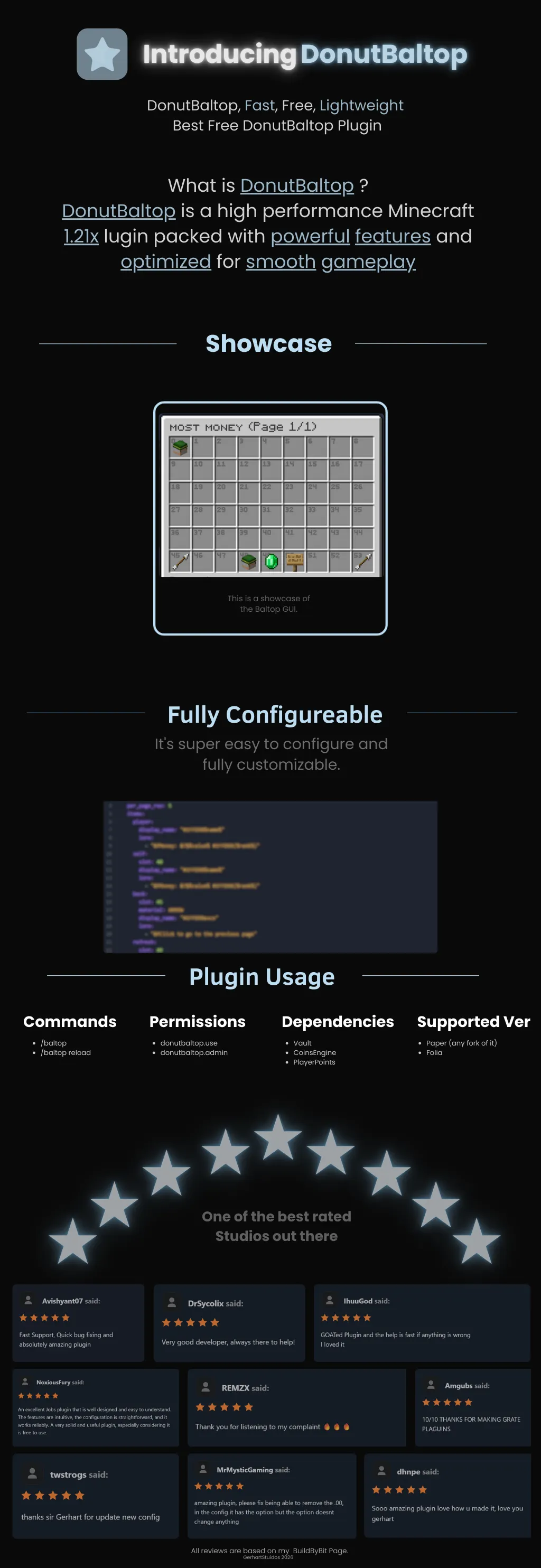 DonutBaltop is a fast, flexible, and fully configurable balance leaderboard plugin for Minecraft servers. It is built around YAML-only configuration, supports modern color codes, and delivers responsive, clean GUIs with holographic displays, caching, and powerful multi-economy support. No hardcoded messages, no hidden fallbacks – everything is configurable and reloadable.
