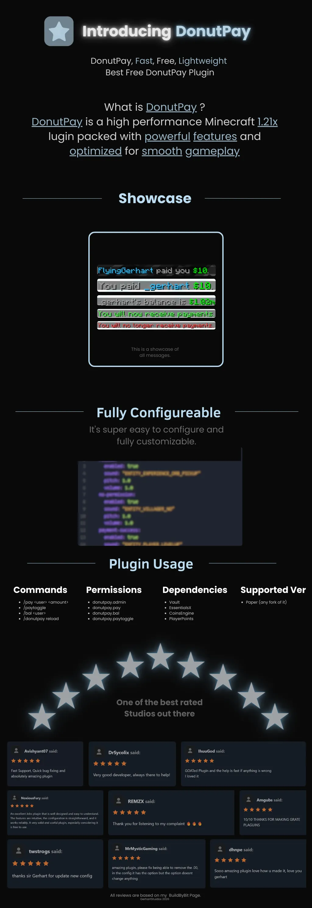 1 DonutPay is a modern, player‑friendly payment plugin that makes sending money fast, clear, and safe. Players can pay each other confidently with short, readable amounts and polished feedback, while admins retain full control over the experience through simple, reloadable configuration.