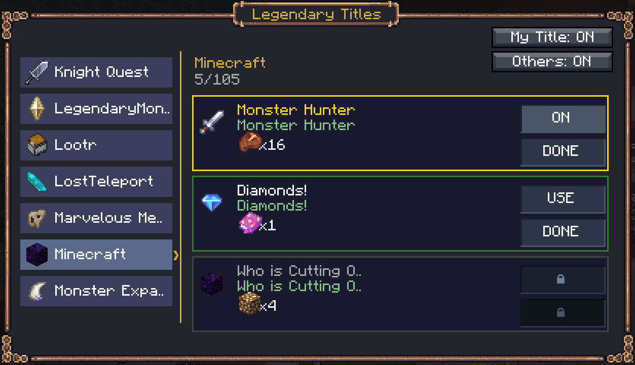 Legendary Titles transforms Minecraft’s achievement system into a fully customizable and richer experience. What began as a title mod has evolved into a comprehensive tool that redefines how players engage with achievements, offering unique and visible rewards.