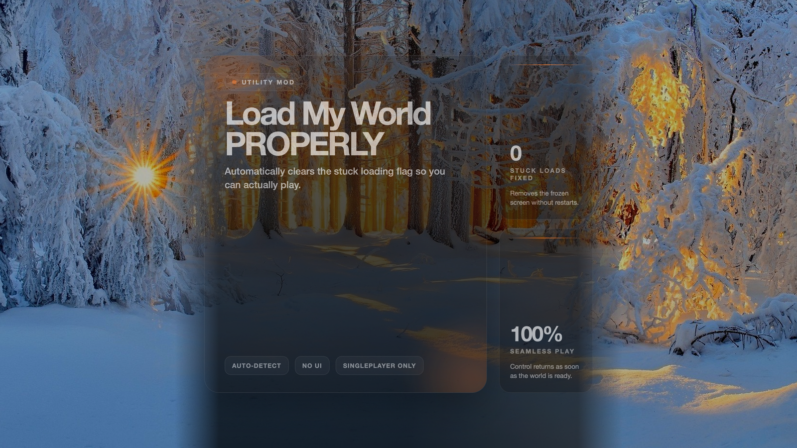 This mod watches the singleplayer client and, when the game gets stuck on the black screen after loading a world, it forces the game to continue so you can actually play. It does this automatically without any extra steps from you.
