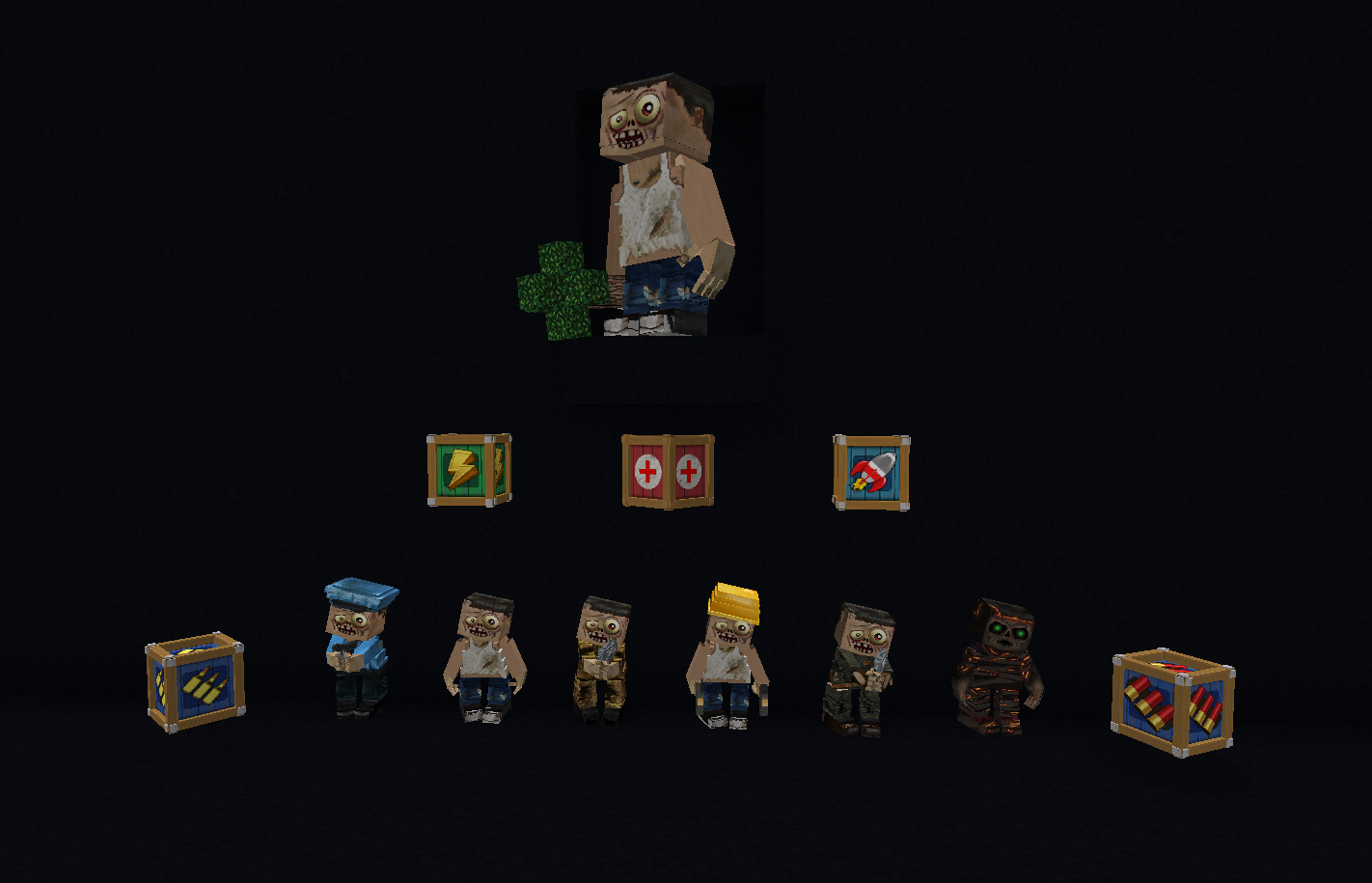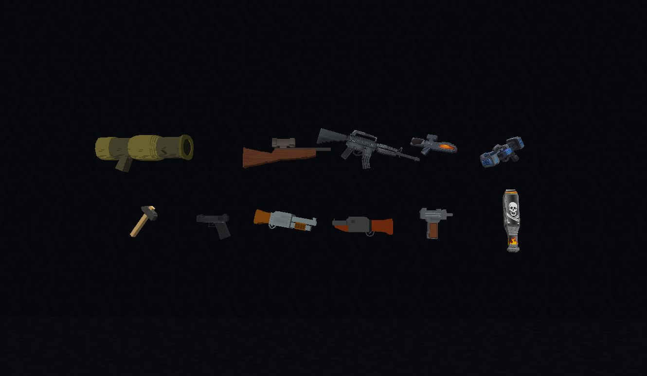 Pickaxe, Baseball bat, Pigal, Uzi, Shotgun, Sawn-off shotgun, Riffle, Sniper rifle, Laser sniper Rifle, Bazooka, BFG, Magic wand (creative only), Peashotter (Command only)