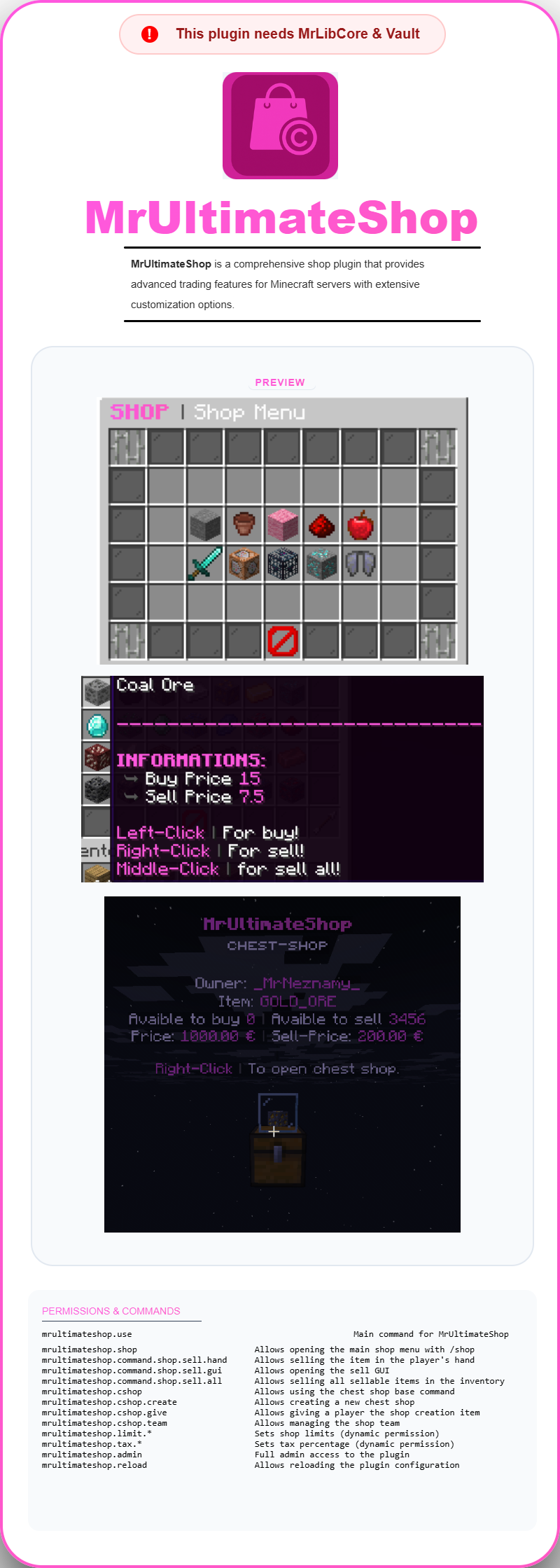 Description MrUltimateShop is a comprehensive shop plugin that provides advanced trading features for Minecraft servers with extensive customization options.