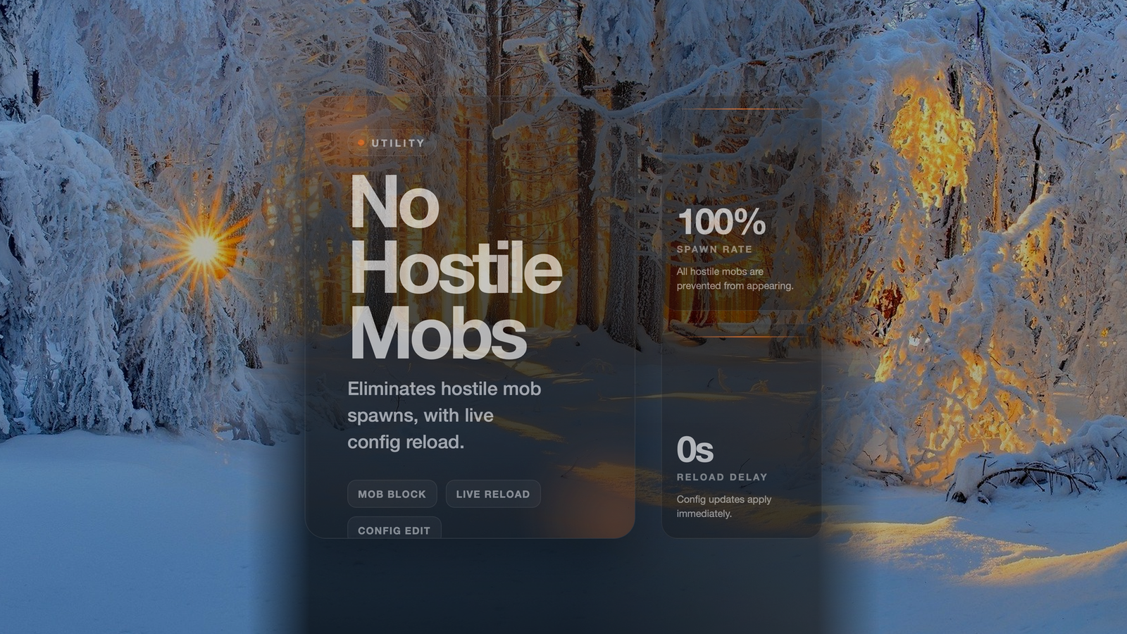 This mod stops hostile mobs from appearing in your world, no matter the difficulty setting. You can also edit a simple config file to choose exactly which mobs are blocked, and the game will pick up any changes without needing a restart.