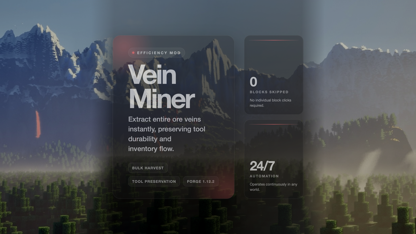 Mine entire ore veins and connected blocks at once with this highly optimized vein mining mod! Built from the ground up to address common complaints and implement the most requested features from the community.