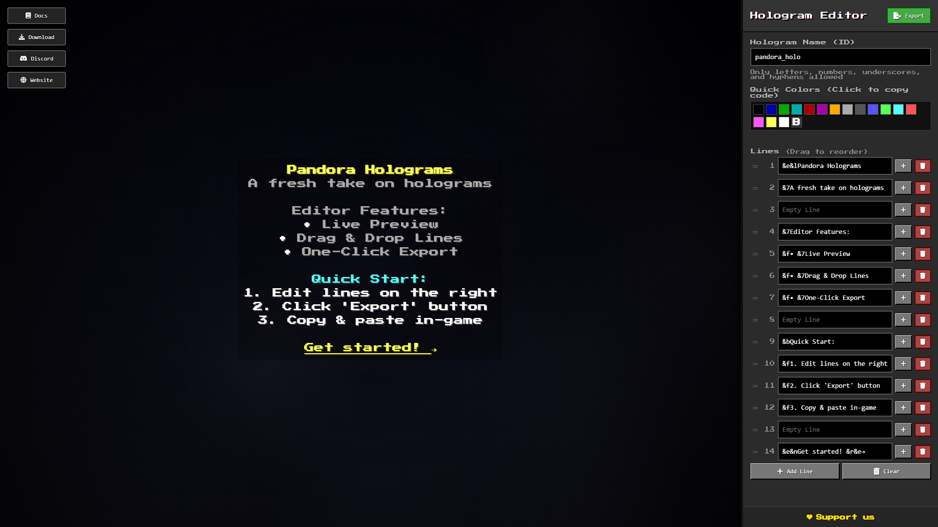 PandoraHolograms is a modern, feature-rich hologram plugin designed for Paper/Spigot servers. It provides an intuitive command system, seamless PlaceholderAPI integration, and a beautiful web-based editor for creating holograms visually.
