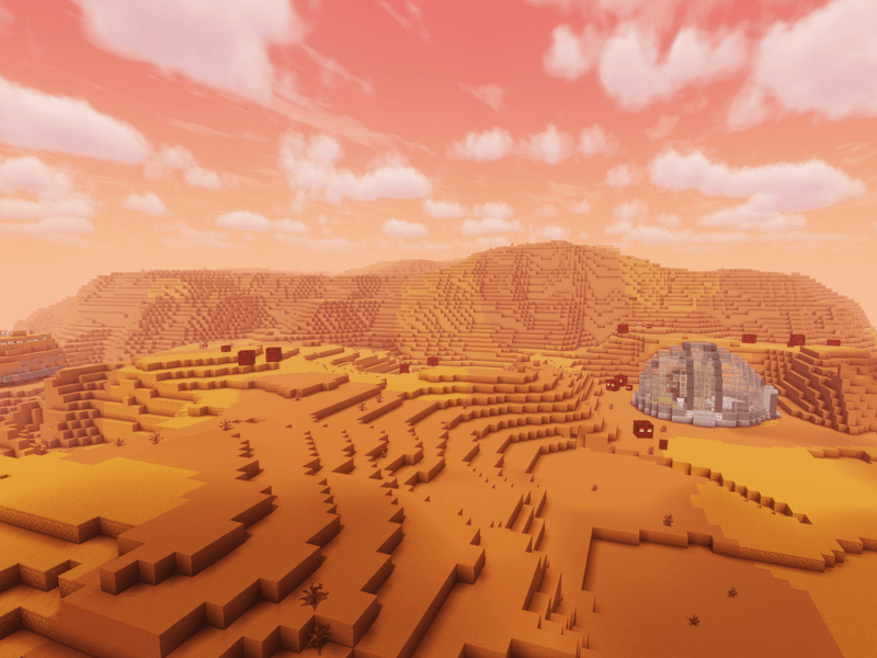 Biome désertique avec roches rouges, dunes et structures abandonnées.