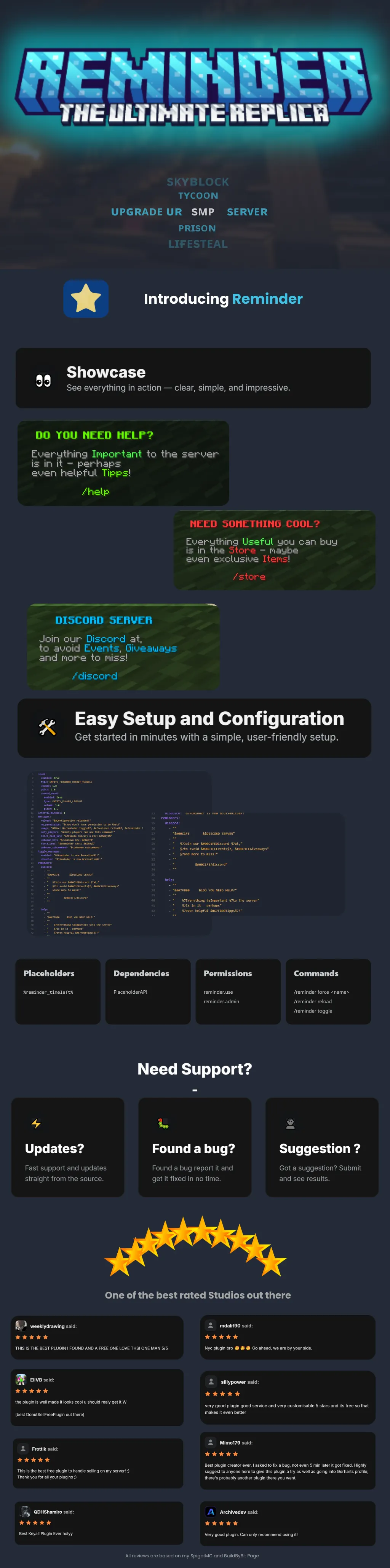 1 SimpleReminder is a modern, Paper‑ready broadcast plugin that lets you deliver polished, multi‑line reminders to your players at clean, configurable intervals. The entire experience is driven by YAML: message groups, interval timing, sound cues, and text formatting are all fully customizable and reloadable in‑game, so changes take effect instantly without restarts. Advanced color support covers both hex and legacy codes across chat messages, ensuring your reminders match any server theme.