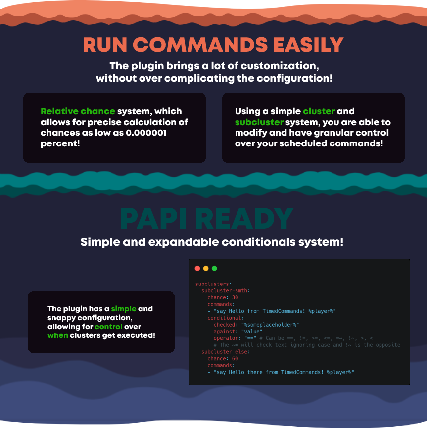 The plugin brings a lot of customization, without over complicating the configuration! Relative chance system, which allows for precise calculation of chances as low as 0.000001 percent! Using a simple cluster and subcluster system, you are able to modify and have granular control over your scheduled commands!