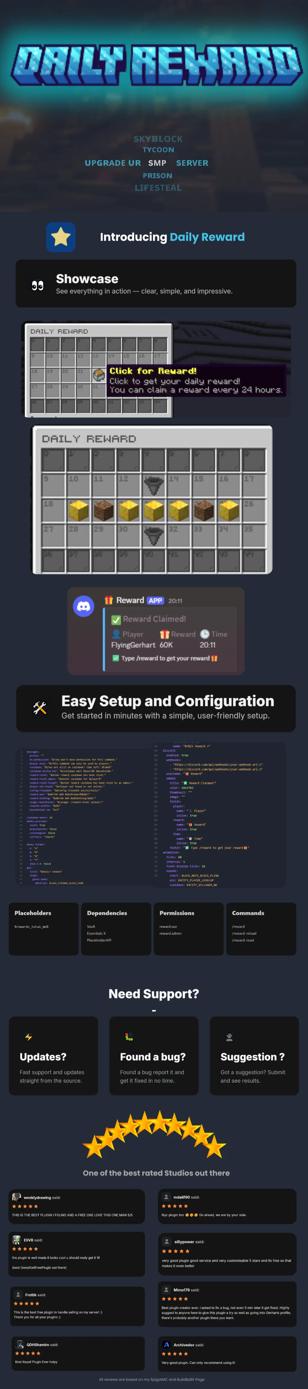 Reward is a modern daily reward plugin that lets players claim prizes through a clean, responsive GUI with a satisfying animated reveal. Every part of the experience is driven by YAML: messages, GUI titles, money formatting, economy provider selection, and sounds are all fully configurable and reloadable in‑game with /reward‑reload, so changes apply instantly without restarts. Advanced color support includes both hex (#RRGGBB) and legacy codes, rendering consistently across chat and the action bar for a polished look on any server theme.