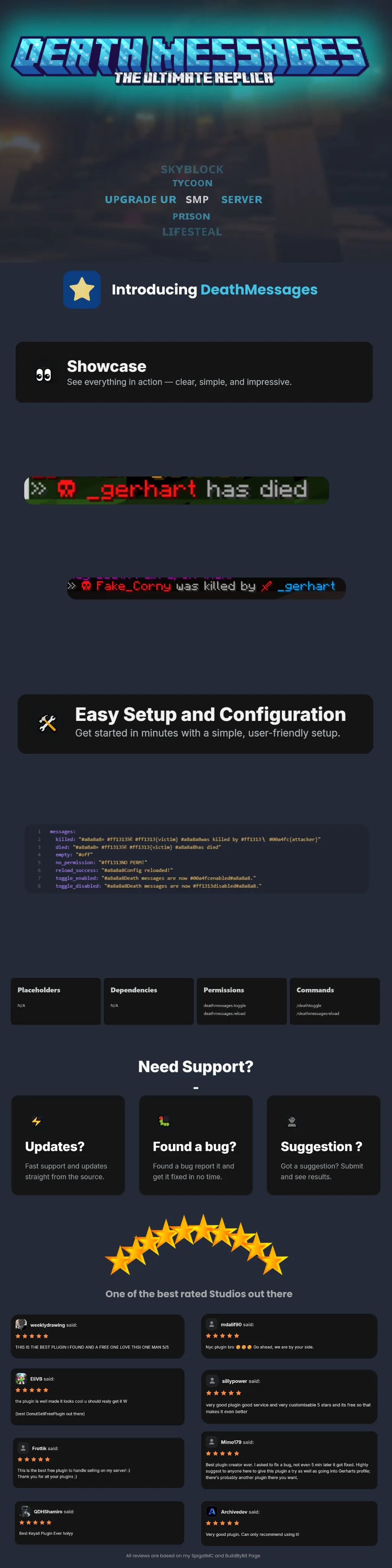 Built for Paper 1.21+, DeathMessages uses efficient event handling and asynchronous scheduling for thread safety and consistent performance under load. There are no hardcoded messages or hidden fallbacks—just fast, reliable death notifications, clean messaging modules, and a lightweight setup that gives you full control over how your server commemorates every player's demise.