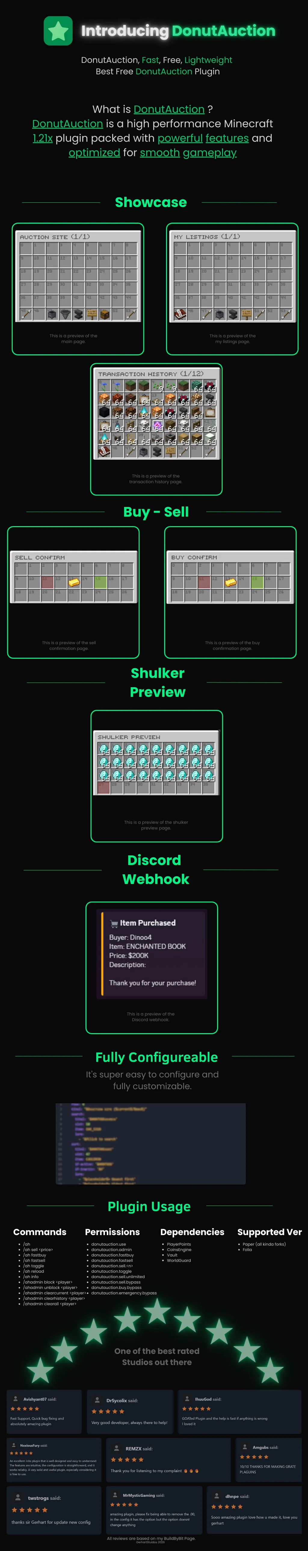 ✨ Key Features 📝 Fully configurable messages & GUIs All texts and GUI titles are loaded from messages.yml and gui.yml 🎨 Advanced color code support Hex (&#RRGGBB, #RRGGBB, &RRGGBB) and legacy & / § 💾 Transaction storage Global and per-player history for tracking and statistics 🔐 Flexible sell permissions Dynamic limits, donutauction.sell.unlimited, and clean admin inheritance 📦 Recursive container blacklist Prevents selling blocked items inside Shulkers or Bundles 🔄 Central reload system Reloads configs and GUIs without restarting the server 💰 Custom money formatting Short formats (k / m / b / t / q) via money-format.yml 🚨 Emergency disable mode With bypass permission for trusted players 🛠️ Admin utilities Clear items or transaction history per player, smart tab-completion ⚙️ Configuration & Storage 📄 YAML-only configuration (no hardcoded strings) 💬 Chat, Actionbar, Title & Subtitle modules included 🗄️ Local SQLite storage 🔌 Compatibility