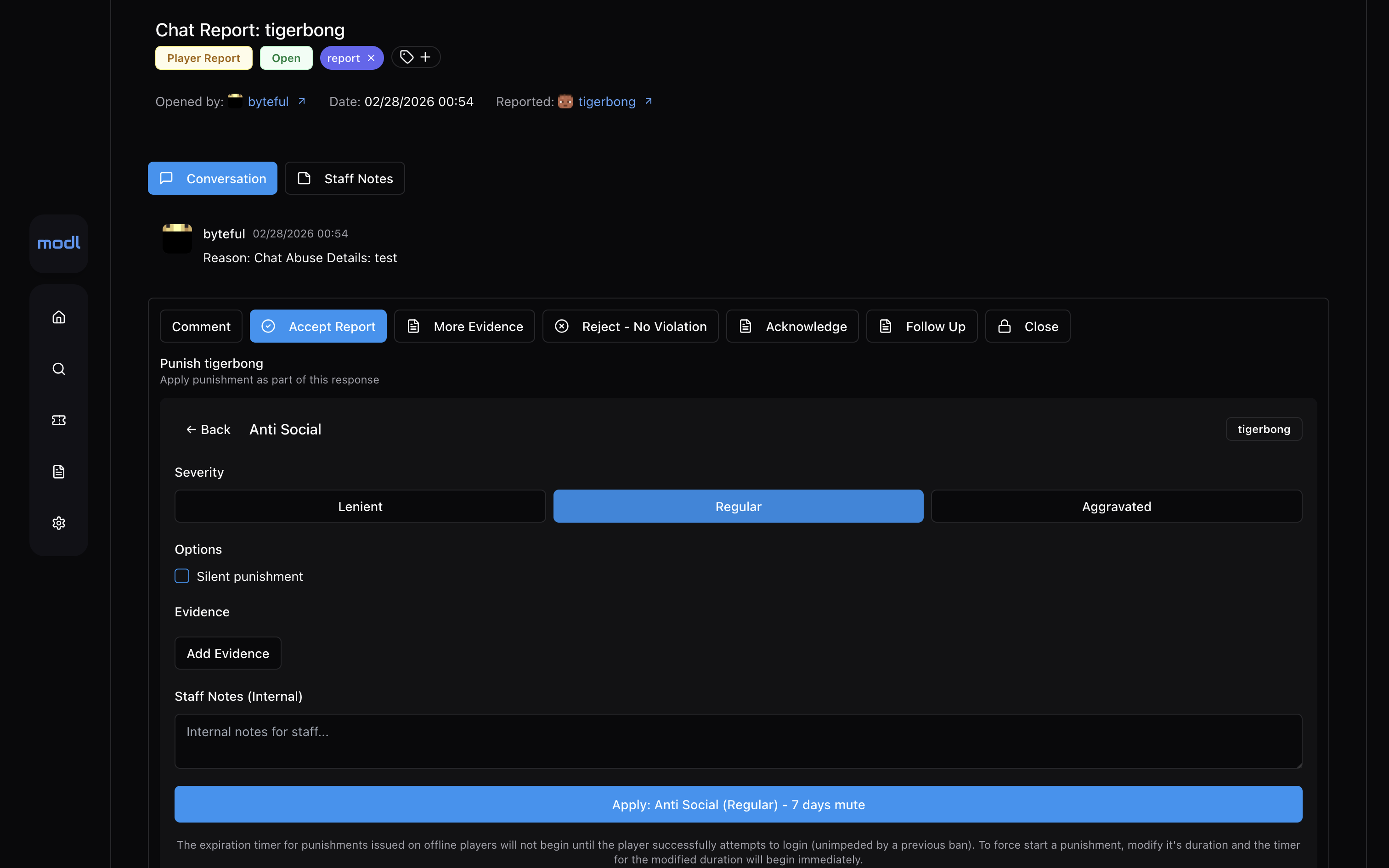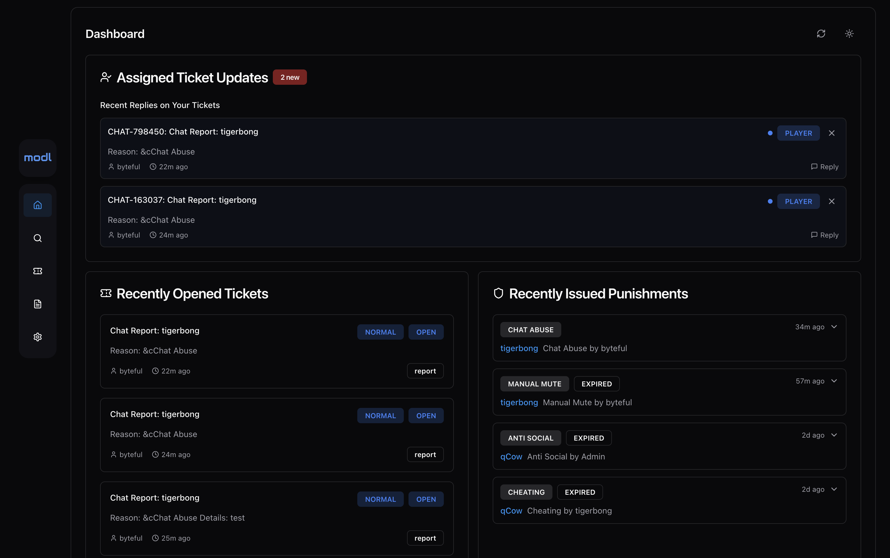 • Link tickets to punishments that will auto-close the ticket and send a response letting the reporter know the offender was punished. Also can be used as evidence when hooked up to modl-anticheat-bridge (Anti-cheat automatically creates reports based on flags)