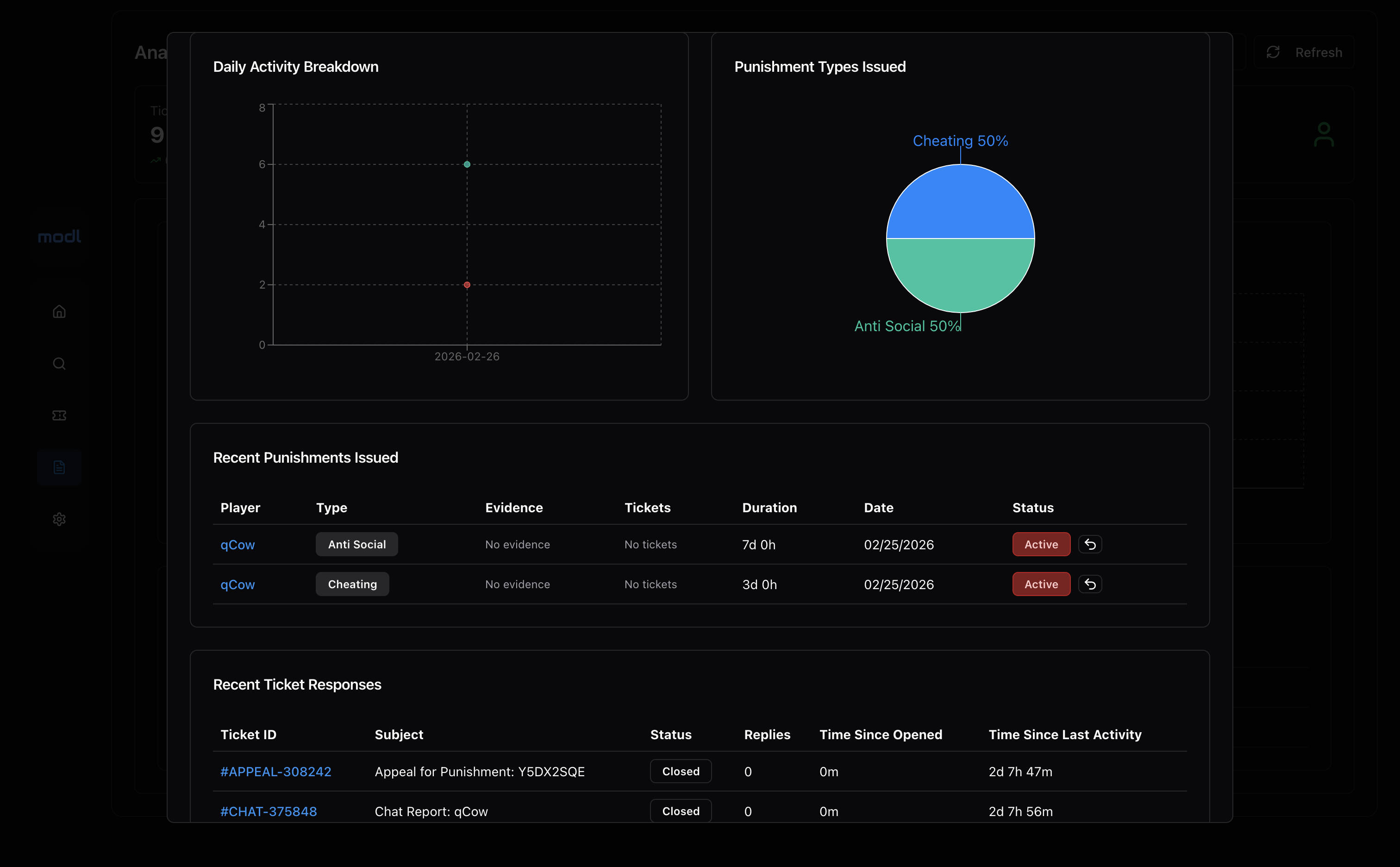 • See statistics on average ticket response times and staff activity (ticket responses, punishments issued, etc)