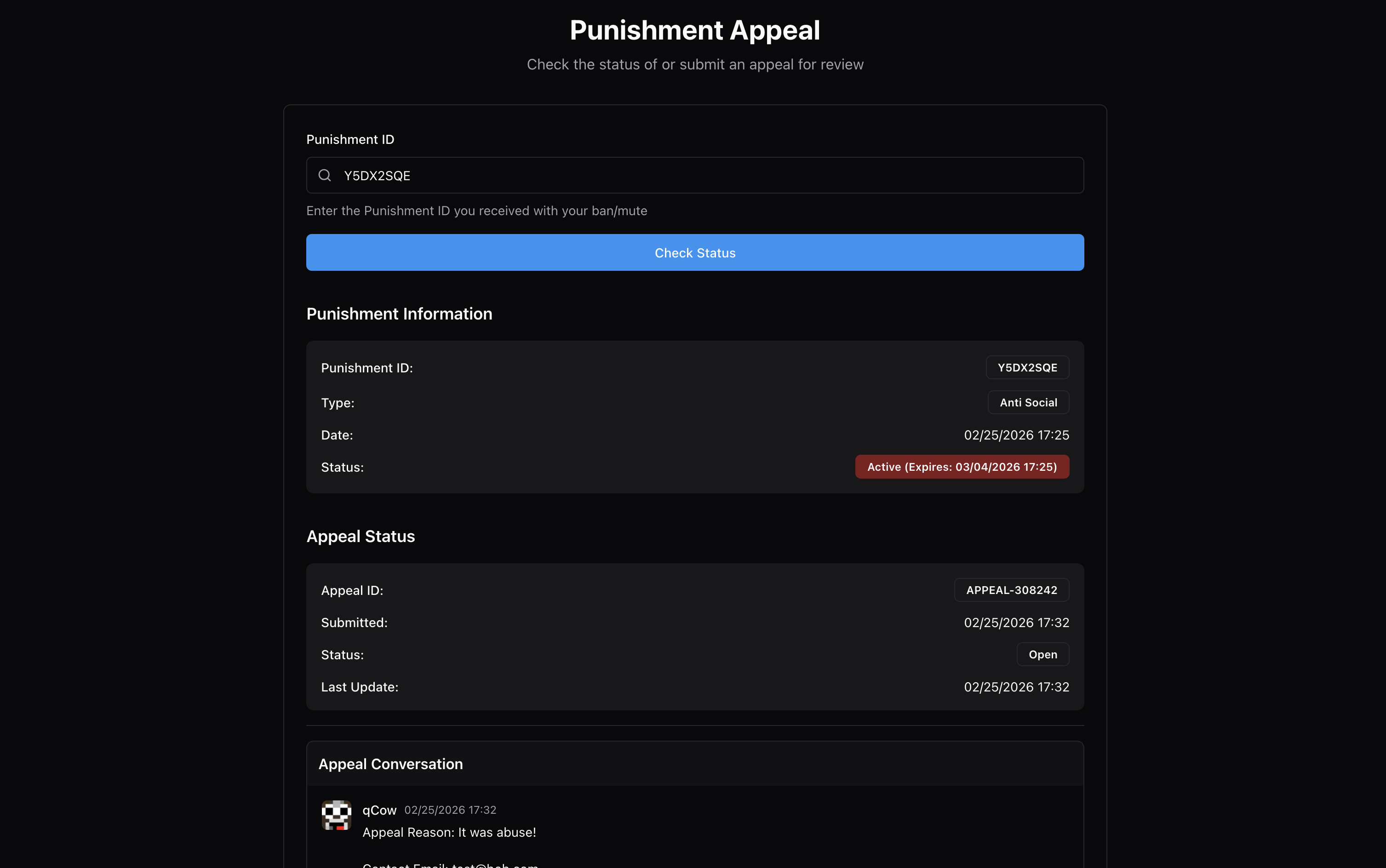 • 8-char alphanumeric ID system for streamlined appeal system, staff see all punishment details and can pardon/change duration without leaving the page. Customize the appeal page for each different punishment type