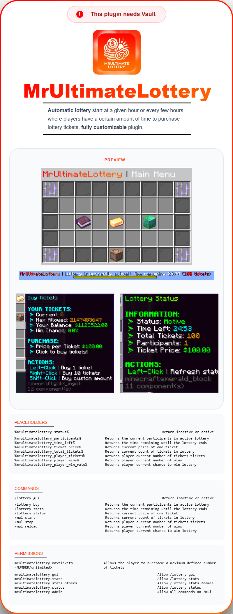 MrUltimateLottery is a fully customizable automatic lottery system for Minecraft servers.