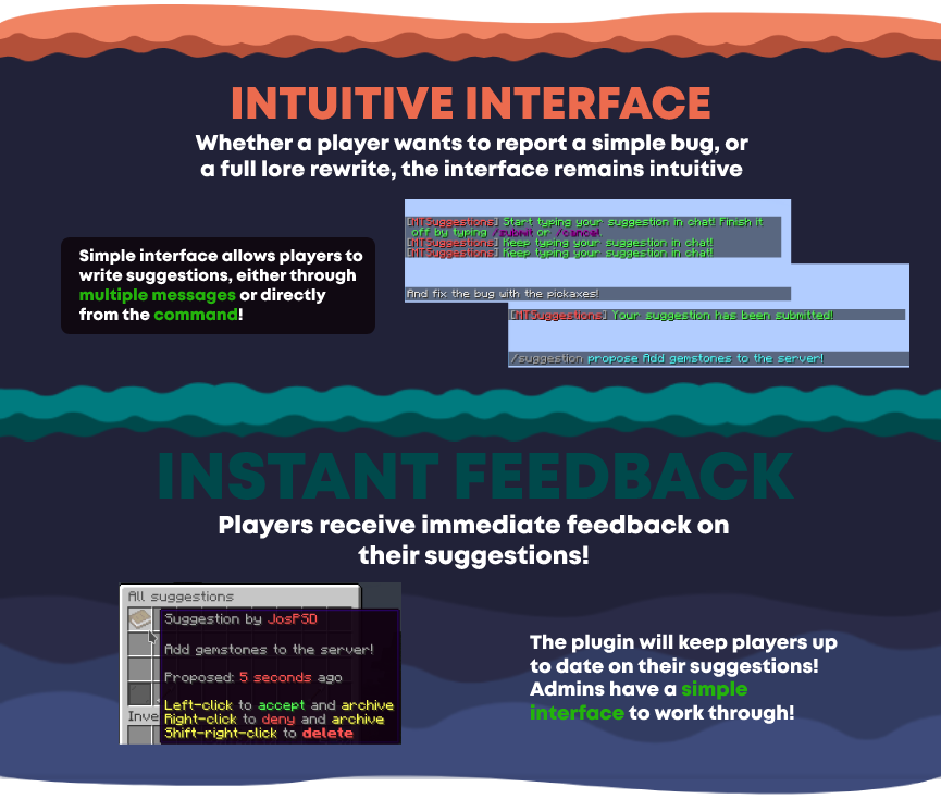 The plugin will keep players up to date on their suggestions! Admins have a simple interface to work through!