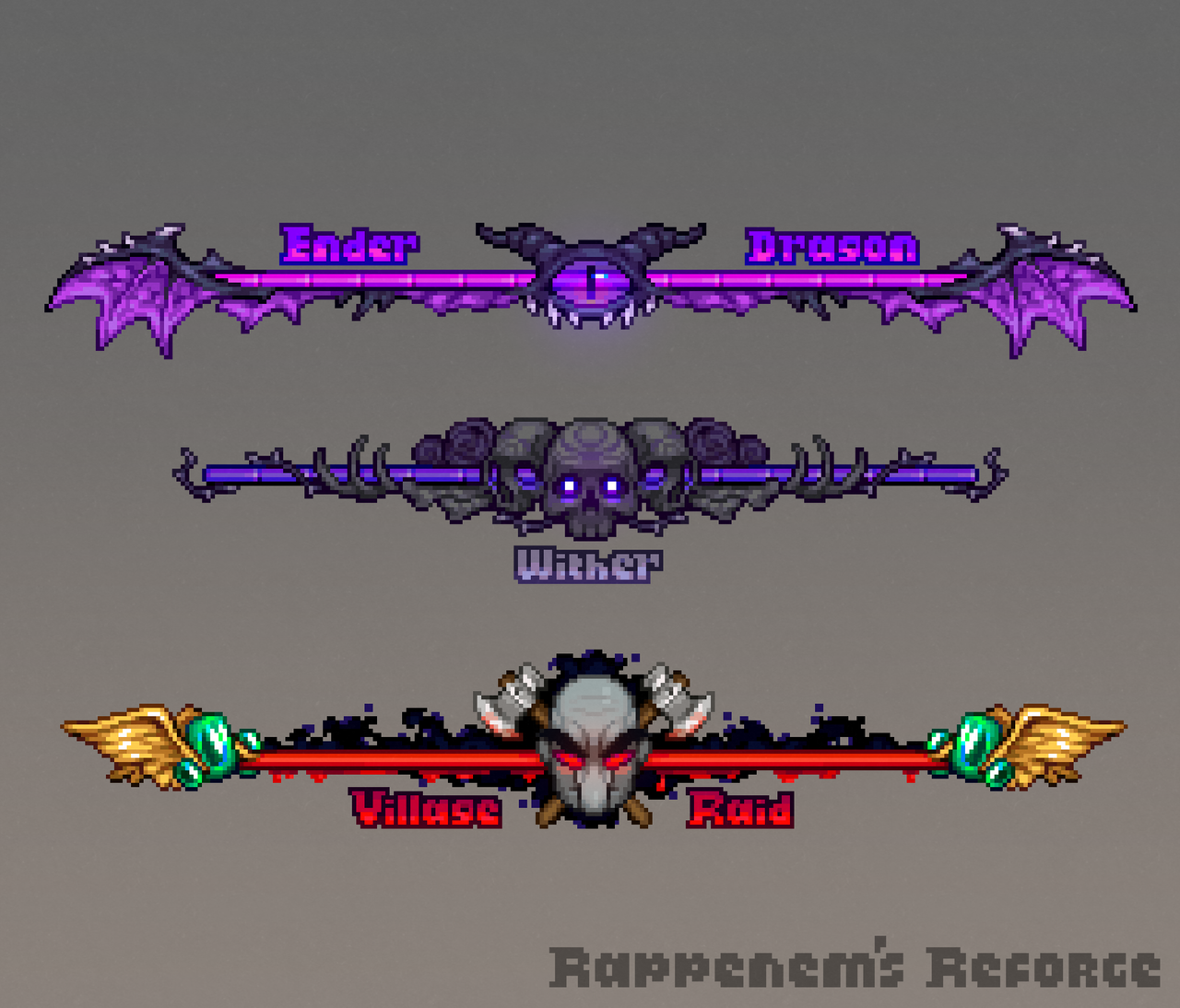 1/ An aspect of the lang files used to make these sprites actually replaces all instances of the "Wither", "Ender Dragon" and "Raid" text with the overlay sprites which can lead to the occasional odd visual.